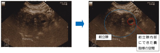 病気がかなり進行しなければうんちは出なくなりませんが、前立腺の内部に嚢胞(袋状で内部が液体のもの)ができる場合があります。